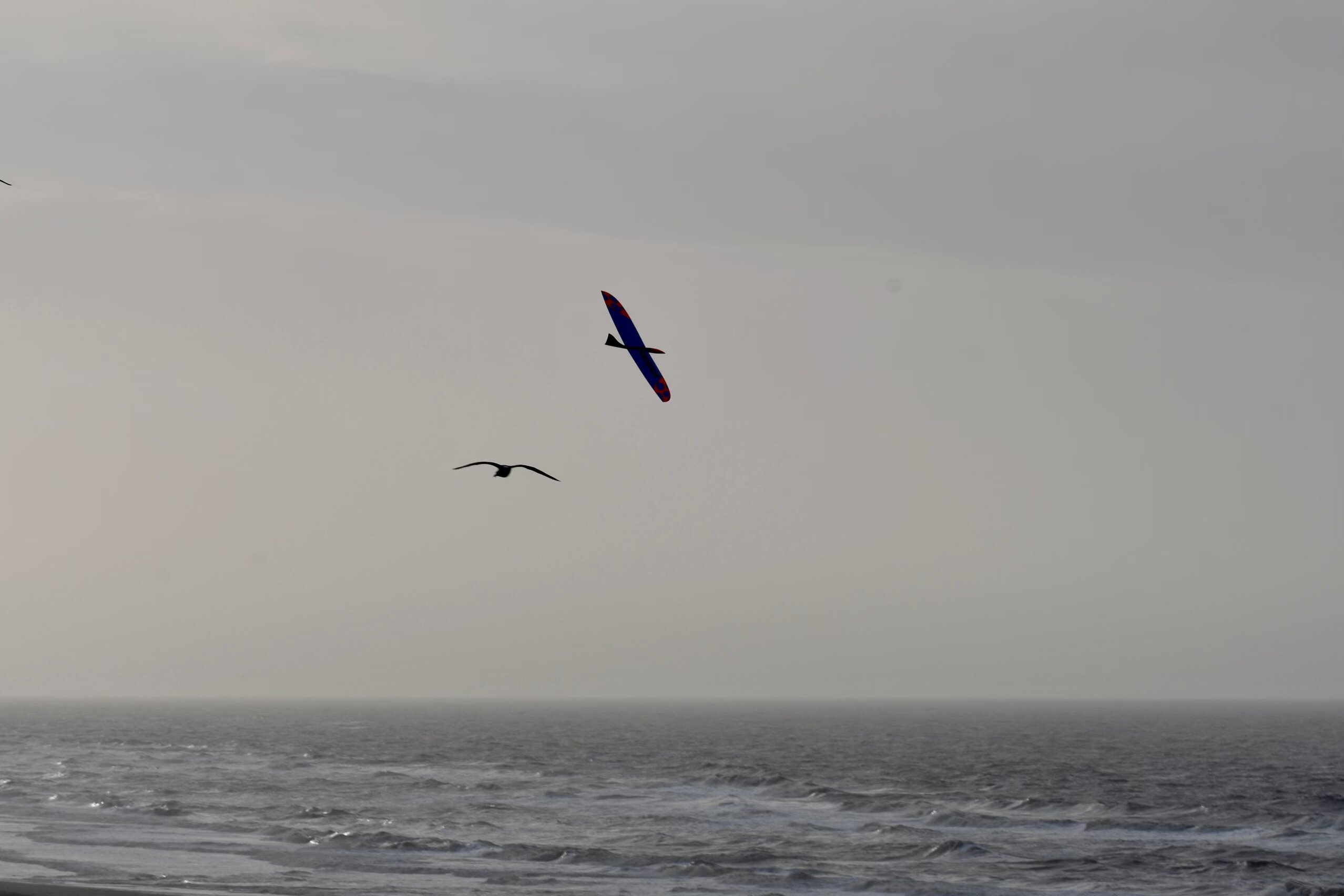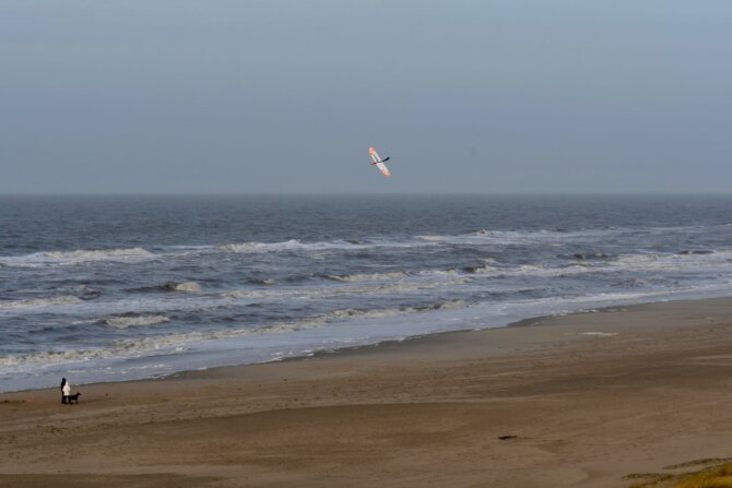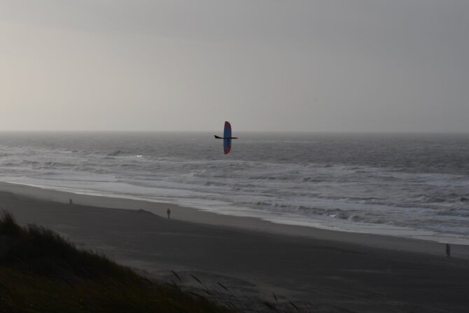 So, heute konnte ich hier  – wie erhofft – endlich mal fliegen. Der Wind war eher lau, kam sehr schräg aus SW zur Dünenkette, hat aber für meinen leichteren Riddick (sog. Standartversion) gereicht. Vorteil des sehr spitzen Winds zum Hang war, dass ich bequem neben mir oben auf den Dünen landen konnte: das Modell verlor gegen den Wind schnell an Tempo und ließ sich ob auf den Dünen, also jenseits des Hauptauftriebfelds, sehr gut absetzen. Morgen fahren zurück nach Hause 🏠; die fliegerische Ausbeute war also recht überschaubar, aber was kann man Ende November im hohen Norden auch erwarten.