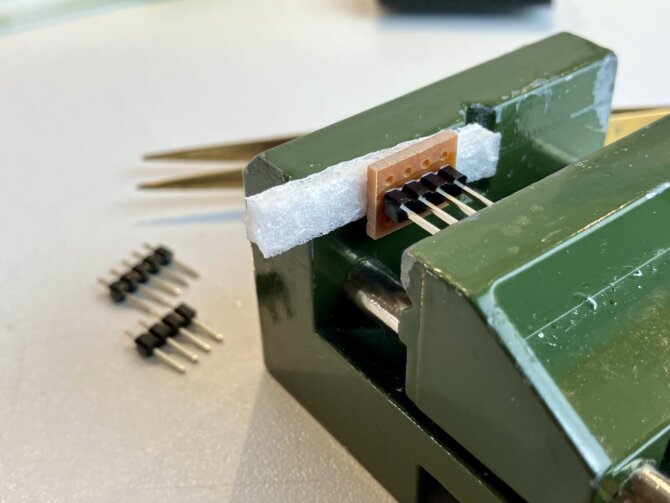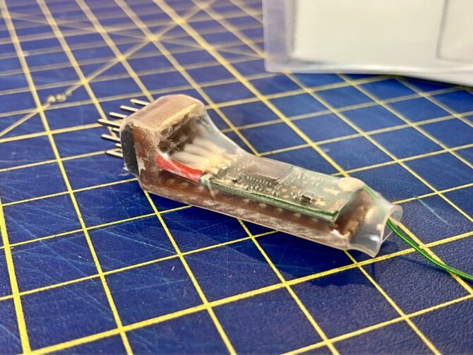 hier also der erste versuch, einen möglichst kompakten und leichten „normalen“ empfänger aus dem kleinen board zu machen. ich musste alle kontakte mit epoxy vergiessen, die stifte sind in der leiste leicht verschiebbar und werden normalerweise erst durch das verlöten auf einer platine fixiert. zum schluss habe ich das ganze noch eingeschrumpft. funktioniert bislang tadellos und wiegt knapp 3 gramm.