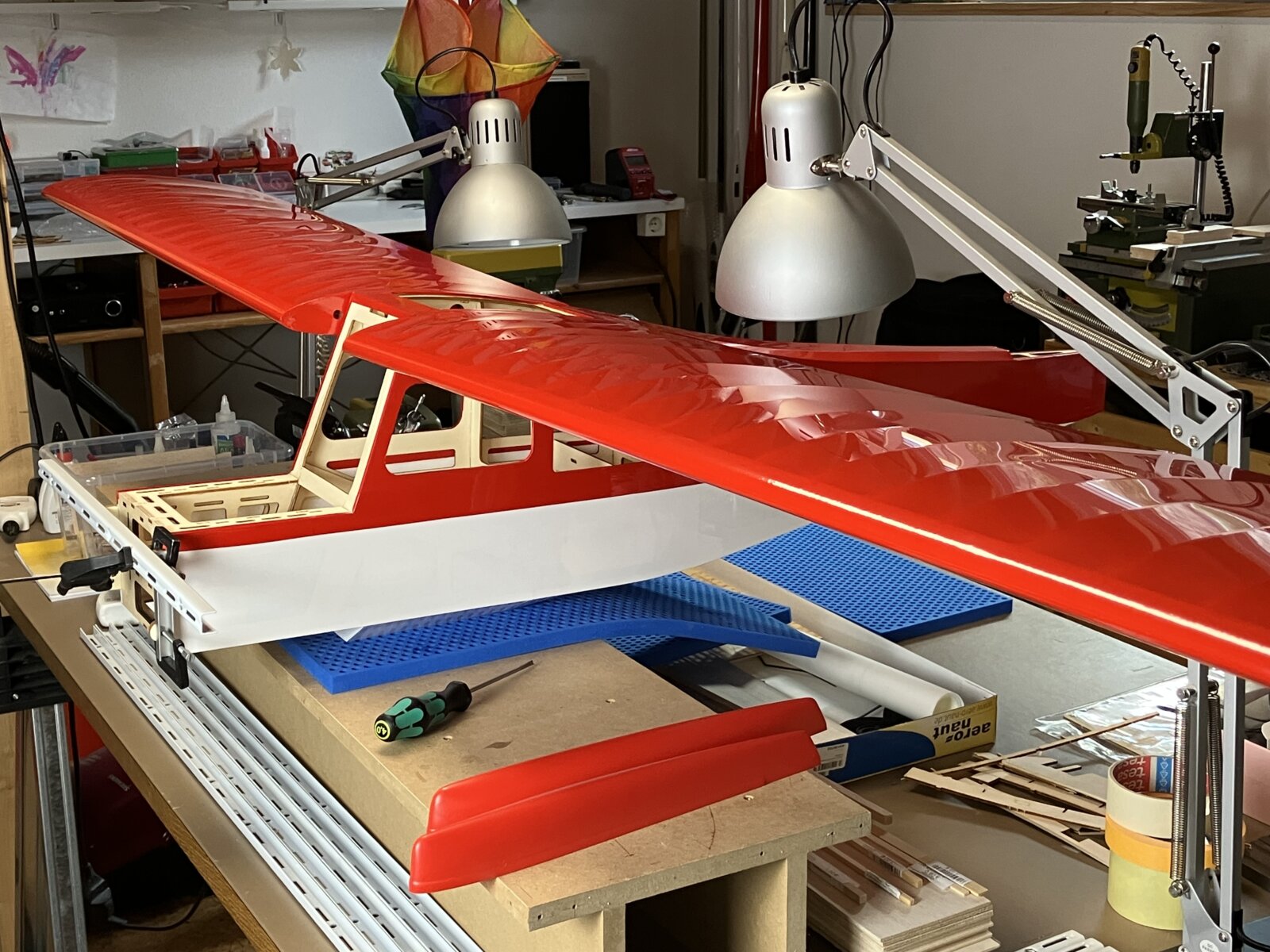 Ich habe heute die grosse Bellanca ausgepackt und mit einer feinen Lötspitze die Öffnungen in Rumpf und Flächen freigelegt, so dass ich das Ganze zusammenstecken kann. Passt alles sehr gut und ist leicht und (zumindest gefühlt) stabil. Einer der Schraubdome für die Motorhaube lag abgebrochen im Kasten, den habe ich mit Weissleim verklebt.
