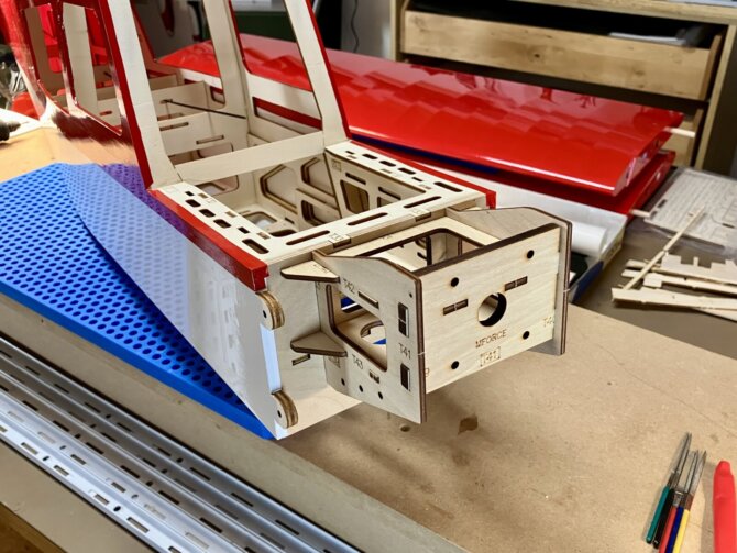 gestern habe ich mir zeit für den motorträger der bellanca genommen. das ist alles sehr sinnvoll konstruiert und präzise aus gutem sperrholz gelasert. einige steckungen gingen etwas stramm, zudem wollte ich an allen verbindungen den abbrand des lasers entfernen und das holz freilegen. verkleben werde ich das mit epoxy, es verbleiben kleine spalte (auch wegen sturz und seitenzug) und der motor wiegt doch einiges.