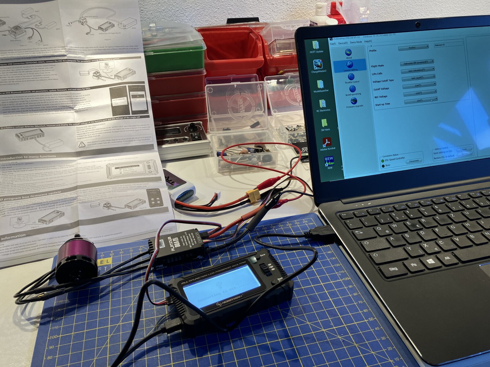 die programmierung des hobbywing-reglers ist nichts für schwache nerven, das ding meldet sich mit lautem piepen und chinesischer menuführung 😄