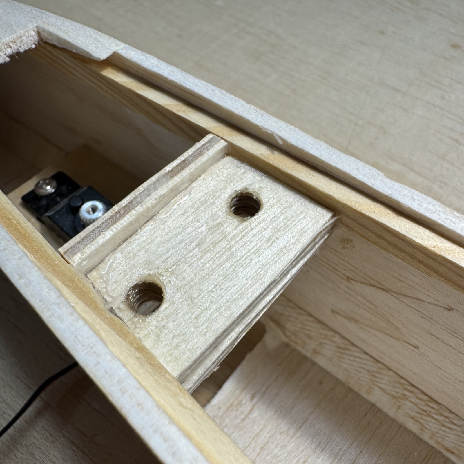 Ja, ich habe schließlich beim kleinen Windwurf die Gewinde für die Nylonflächenschrauben ins Birkensperrholz per Hand hineingeschnitten, Durchmesser M 5. Mit  4 mm Bohrer vorgebohrt. Anschliessend mit hochflüssigem Sekundenkleber gehärtet. Zuvor hatte ich versucht, mit metallenen Gewindeeinsetzen zu arbeiten; die waren aber recht groß und schwer. Beim Einbau dieser Gewindeeinsätze hätte ich fast den Rumpf des Modells zerstört: das Brettchen für die Aufnahme der Hülsen ist zerborsten, musste ich also wieder ausbauen und durch ein neues ersetzen 🥴. Habe mich dann – siehe Foto – für das Schneiden von Gewinden in das Birkensperrholzbrettchen entschieden. Das hat gut funktioniert und dürft stabil genug sein.