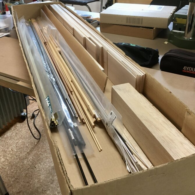 heute habe ich die werkstatt aufgeräumt und die historischen und aktuellen vorräte an balsa-, kiefern-, buchen- und sonstigen leisten sowie den ganzen stahl-, messing-, alu- und carbon-verhau sortiert. der karton dürfte wohl vom ur-flamingo stammen 😃