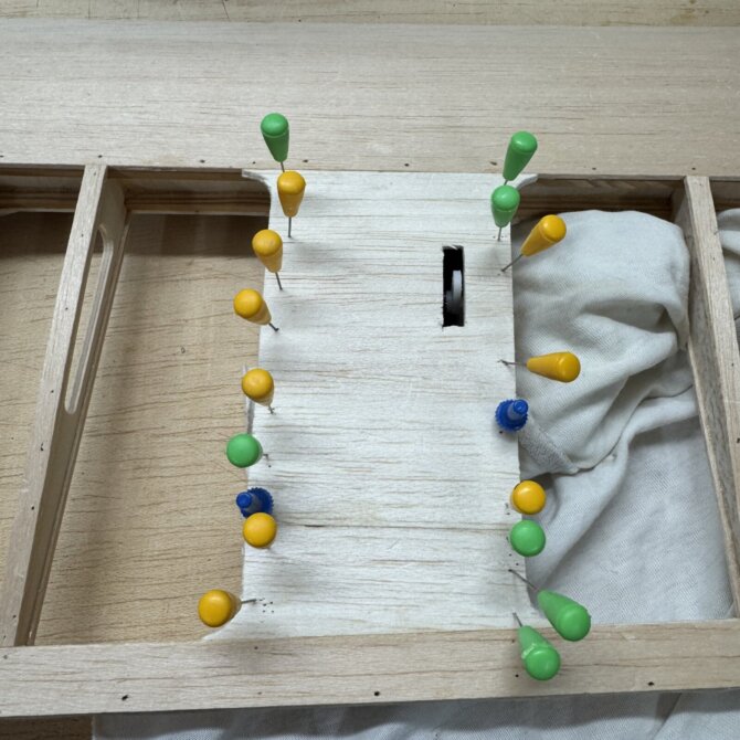 hallo carsten, als ergänzung der bilder gestern und zum besseren verständnis der „sperrholzbrett“-lösung. das gebogene brett sitzt in einer tiefen nut, ursprünglich für die GFK-„gräten“ gedacht (hier noch das muster aus balsa).