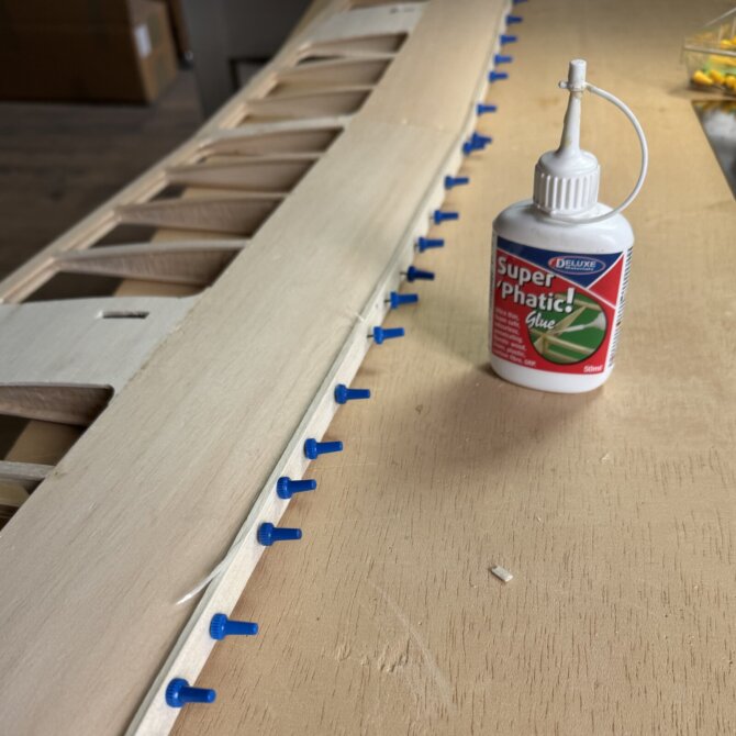 Heute dann etwas gebastelt: Nasenleiste beim kleinen Windwurf angeklebt und Servoschächte mit Balsabeplankung verschlossen, nachdem ich die Servos betriebsfertig eingebaut hatte.