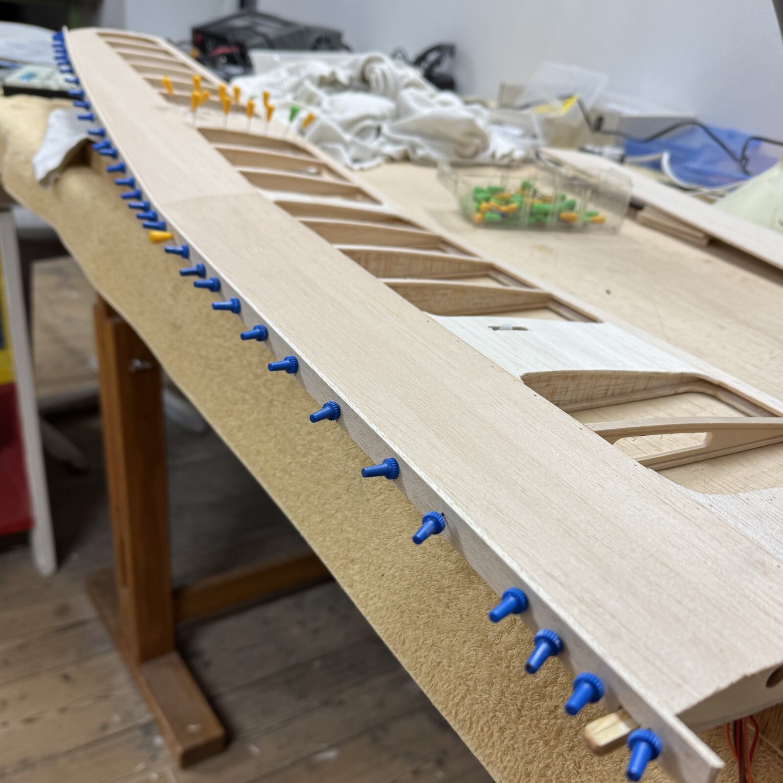 Die Fotos zeigen meine kleinen Fortschritte bei dem Windwurf: Nasenleiste angeheftet, Randbogen erstellt und an geleimt, Servoschachtabdeckung mit Balsa beplankt. Am Wochenende geht es weiter, macht jedenfalls richtig Spaß, mal wieder mit Holz zu arbeiten!