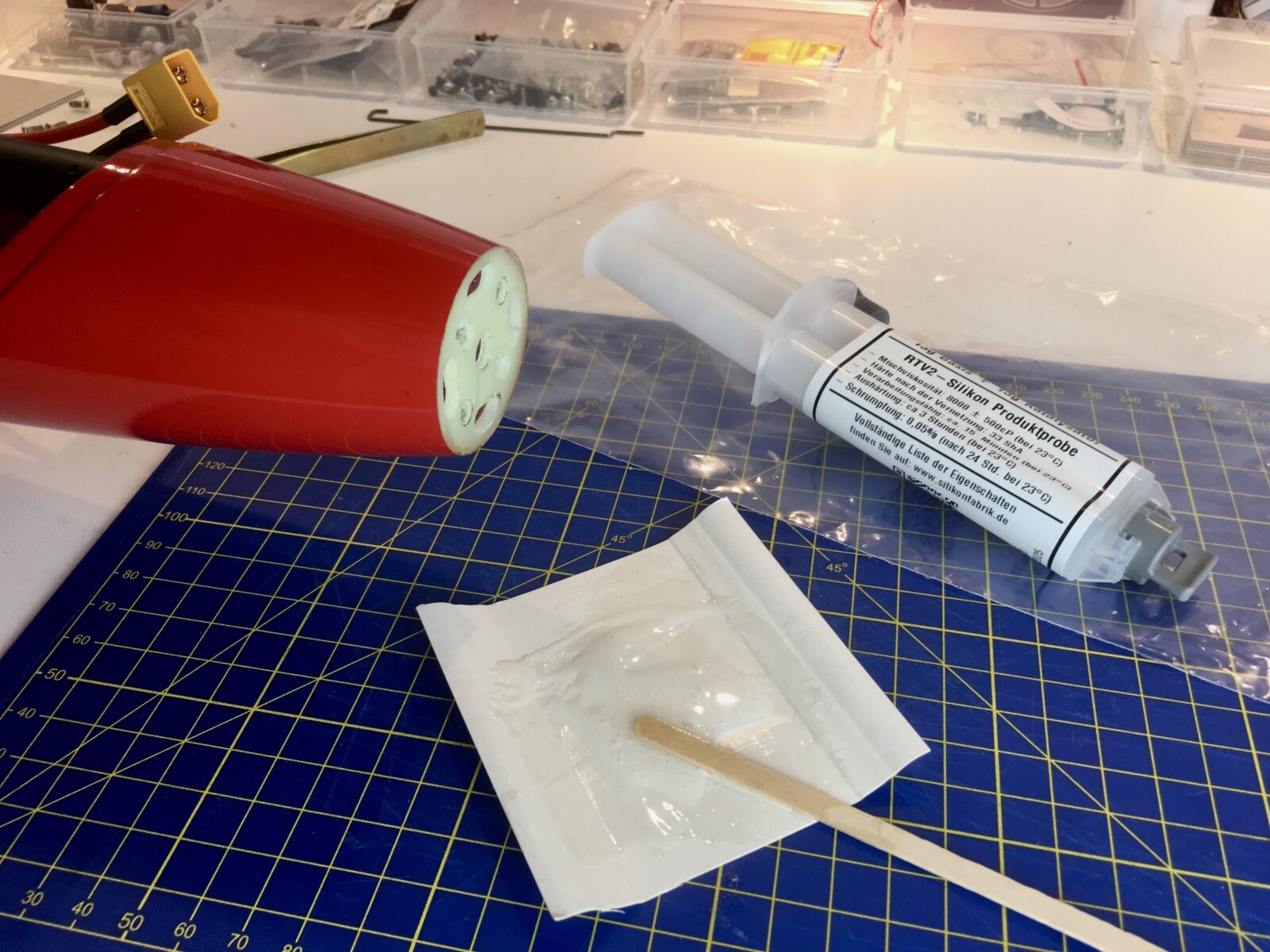 für die verklebung habe ich zum ersten mal 2-komponenten-silikon verwendet, hauptsächlich weil ich die elastosil-tube nicht finden konnte 😅 der kleber ist deutlich fliessfähiger als das normale elastosil, könnte für die eine oder andere anwendung ganz interessant sein.