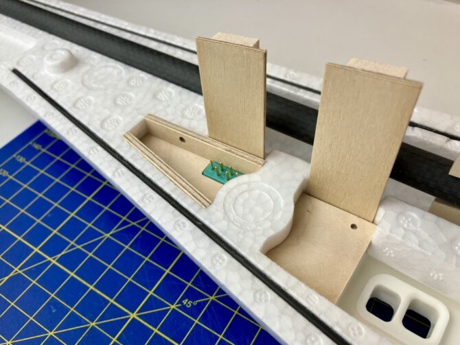 die verbleibende baustelle am heron ist der anschluss der flächenservos. das hat mich etwas grübeln gekostet, war dann aber gar nicht so kompliziert. platz ist vorhanden und die holzteile zuzuschneiden ist kein hexenwerk. die ausschnitte für die stecker habe ich auf der fräse für holz und anschlussrippe gemeinsam gemacht damit das 100% fluchtet. damit ist die kiste jetzt auf dem stand von funray und lentus, und ich freue mich dass die add-ons so gut umsetzbar sind